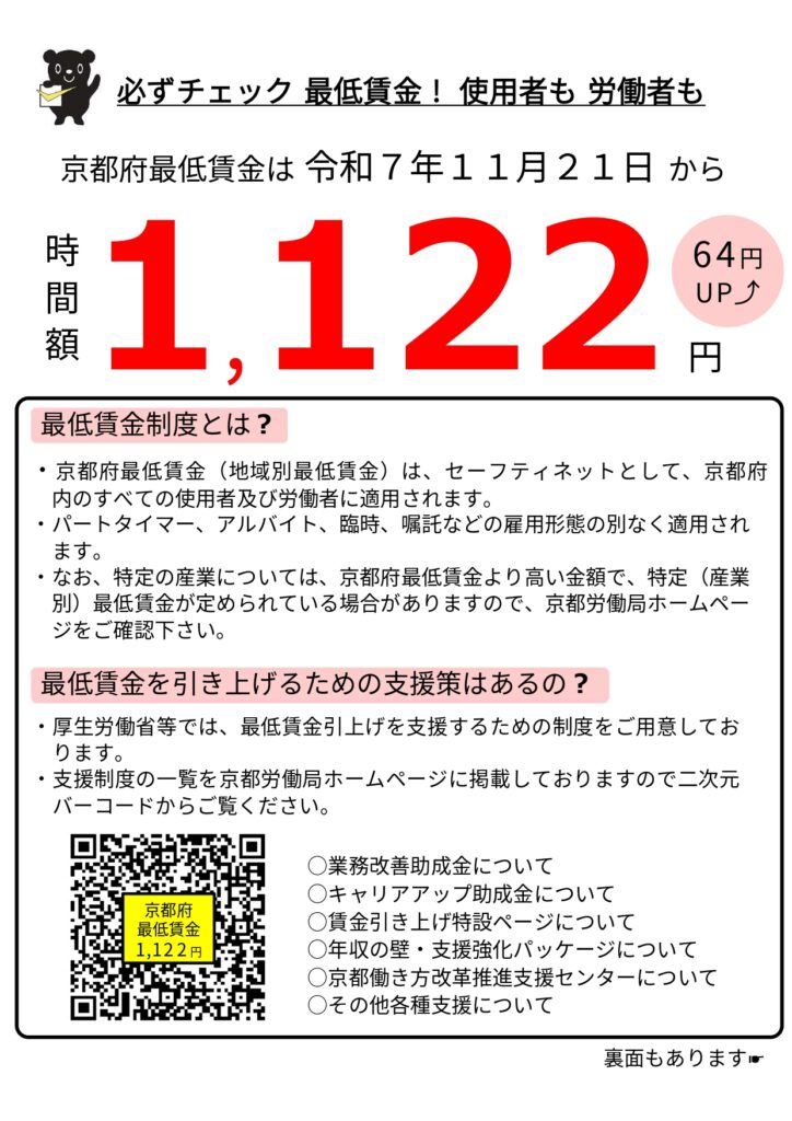 京都府内のすべての使用者及び労働者に適用される京都府最低賃金について令和7年11月21日から(時間額)1,058円から64円引き上げて、(時間額)1,122円に改定されましたので、お知らせします。