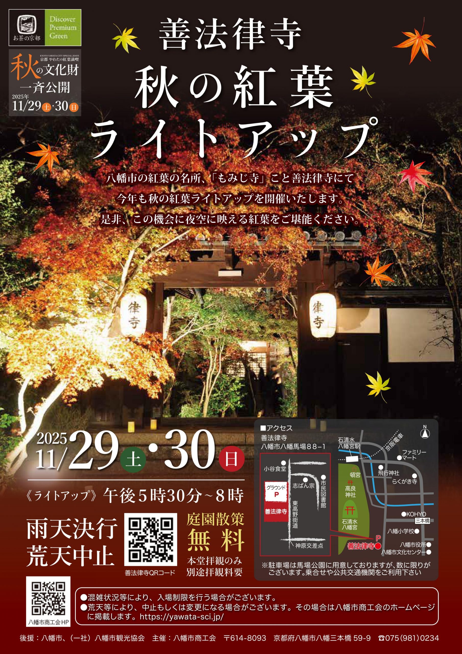 八幡市の紅葉の名所、「もみじ寺」こと善法律寺にて、今年もライトアップを開催いたします。