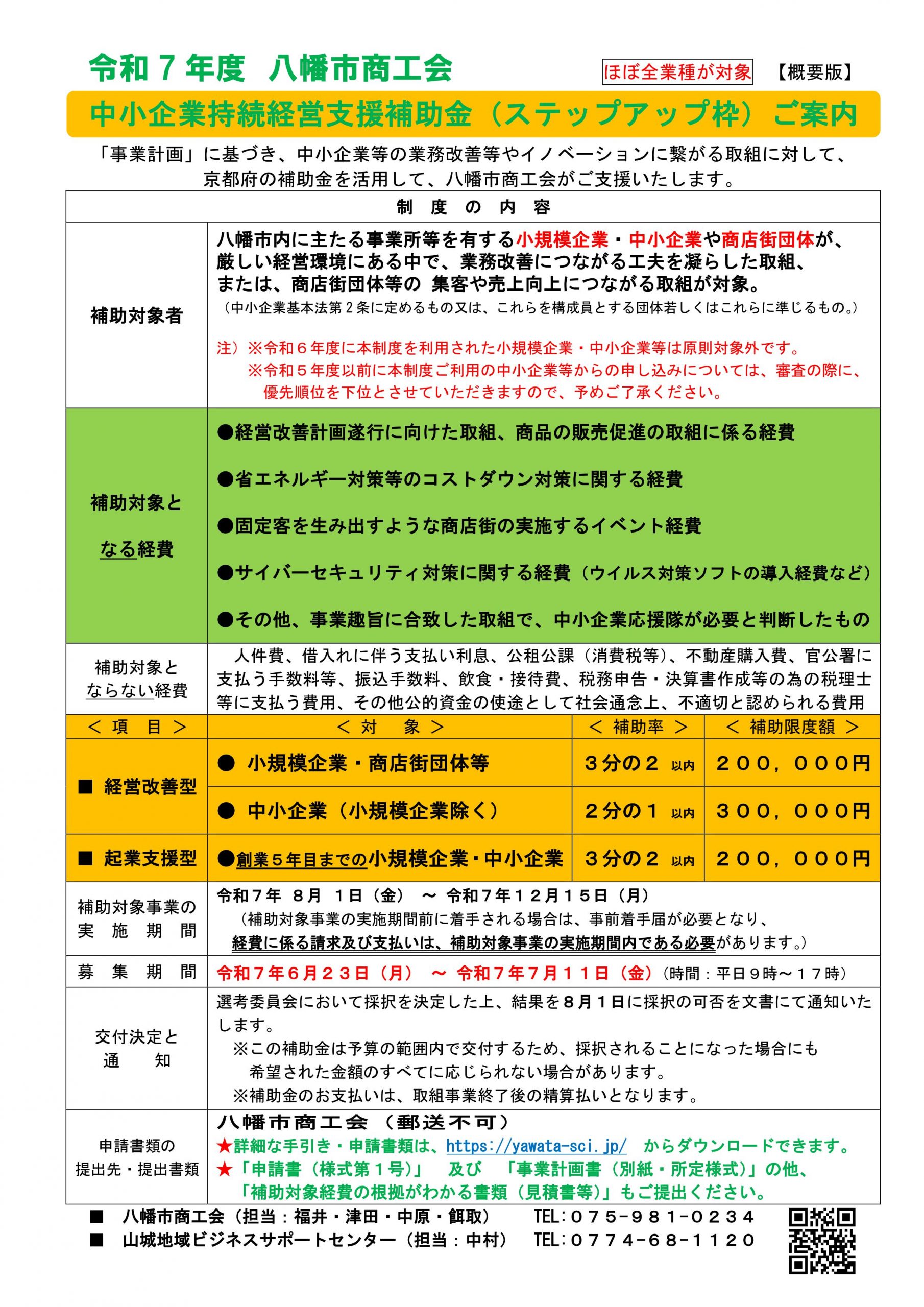 「中小企業持続経営支援補助金(ステップアップ枠)」のご案内 【新着R7/6/9】 R7.06.09 補助金 関連リンク 資料1 案内チラシ【概要版】 資料2 補助事業の手引き【詳細版】 資料3 交付要領【準則】 資料4 交付申請書(様式1・記入例) 資料5 交付申請書(様式1)【事業所名】(Word) 資料6 事前着手届(様式2)【事業所名】(Word) 資料7 事業計画書(様式1別紙・記入例含)【事業所名】(Excel)